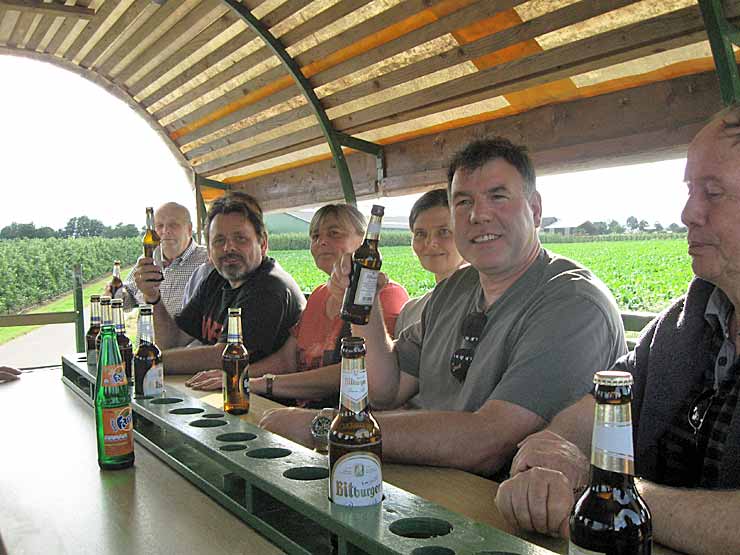 Bei erfrischenden Getränken und herrlichem Ausblick konnten sich die Teilnehmer vom hohen Standard der Obstanlagen überzeugen. „Behang ist prima" wurde des Öfteren geäußert. Bei mehreren Stopps gab es zahlreiche Fragen mit entsprechenden Antworten. Nach 1,5 Std. Rundfahrt fanden sich alle wieder im Betrieb WOLF ein, wo weitere Gäste eingetroffen waren. Vorsitzender FERDI VÖLZGEN dankte den FAMILIEN WOLF während einer kurzen Ansprache für deren Engagement und die Ausrichtung dieses Festes und überreichte ein ansprechendes Weinpräsent. In diesen Genuss kam auch Berater RALF NÖRTHEMANN dem für seine Fachgruppentätigkeit (manchmal nach getaner Arbeit im Dienst) ebenfalls gedankt wurde.