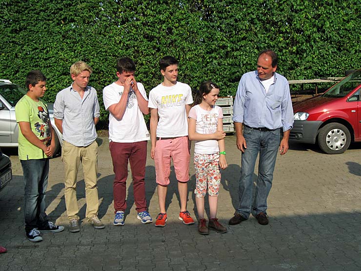 Um die 100 Gäste waren der Einladung unseres Vorsitzenden Ferdi Völzgen und seiner Ehefrau Helga gefolgt, um an einem schönen Sommerabend ein paar Stunden in geselliger Runde zu verbringen. Das Fest begann mit einem Betriebsrundgang, bei dem sich die Teilnehmer vom guten Zustand der Kulturen überzeugen konnten. Bei den Äpfeln konnte nach mechanischer, chemischer und Handausdünnung ein guter Behang festgestellt werden. Wenn man bedenkt, dass Mitte März noch Fröste bis -18* den Obstbäumen zugesetzt hatten und dadurch ein phänologischer Rückstand von ca. 3 Wochen entstanden ist, war Ferdi Völzgen trotzdem optimistisch, die erforderlichen Fruchtgrößen zu erreichen. Nur die Sorte Elstar, alternanzbedingt, trübte geringfügig das Gesamtbild.